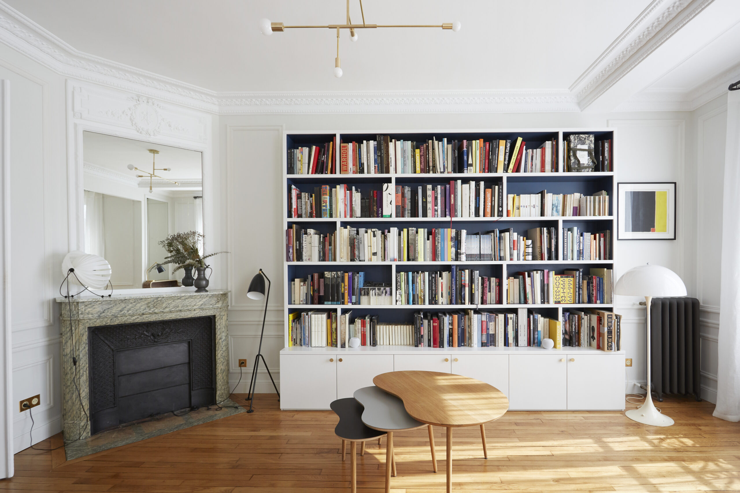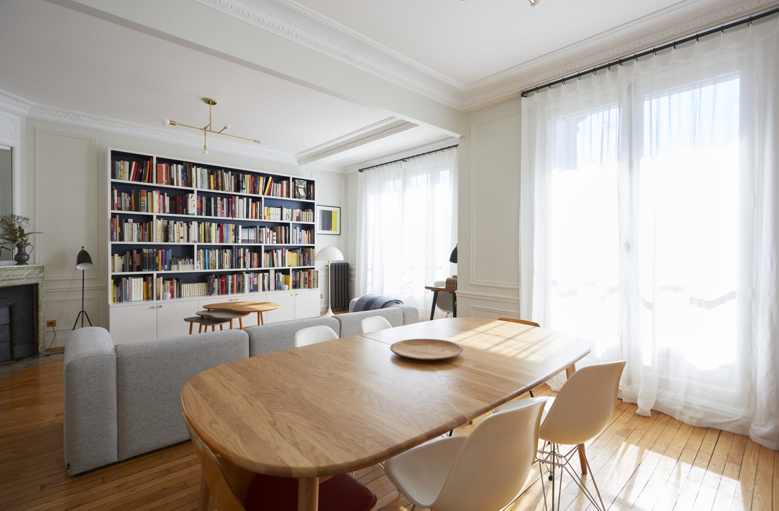 Trois tables gigognes ont été intégrées à l’espace afin de ne pas prendre trop de place face à cette grande bibliothèque, elles font un rappel à la couleur du parquet et du fond de la bibliothèque ainsi qu’aux voilages des fenêtres. Les miroirs ajoutés aux différents coins de la pièce permettent un agrandissement et une illumination de la pièce.