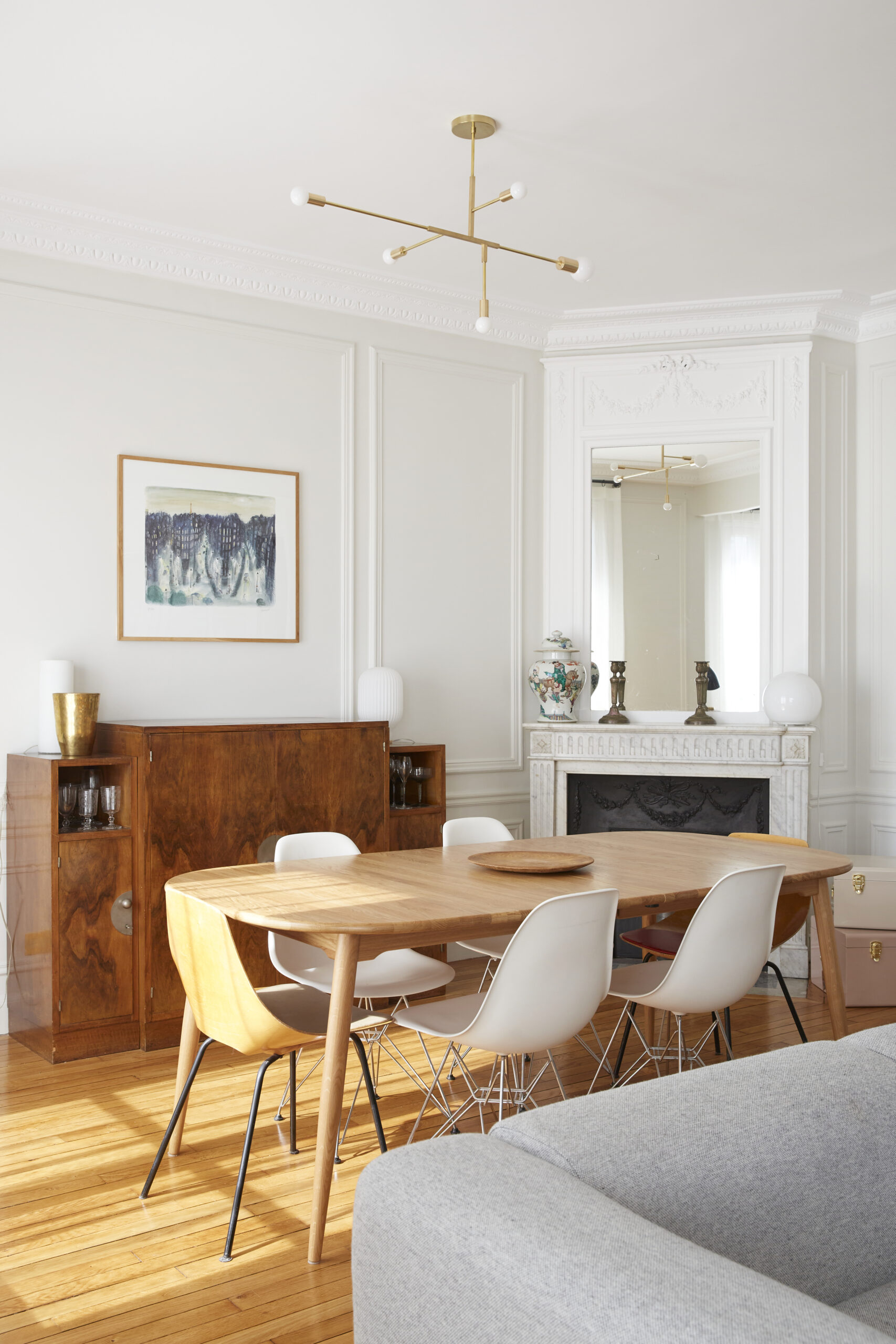 Ce pourquoi les clients ont eu un coup de coeur lors de leur achat est la grande hauteur sous plafond, la luminosité naturelle, le parquet ancien et les moulures d’origine. Le projet de l’architecte devait donc moderniser les espaces tout en conservant ces éléments fondamentaux.