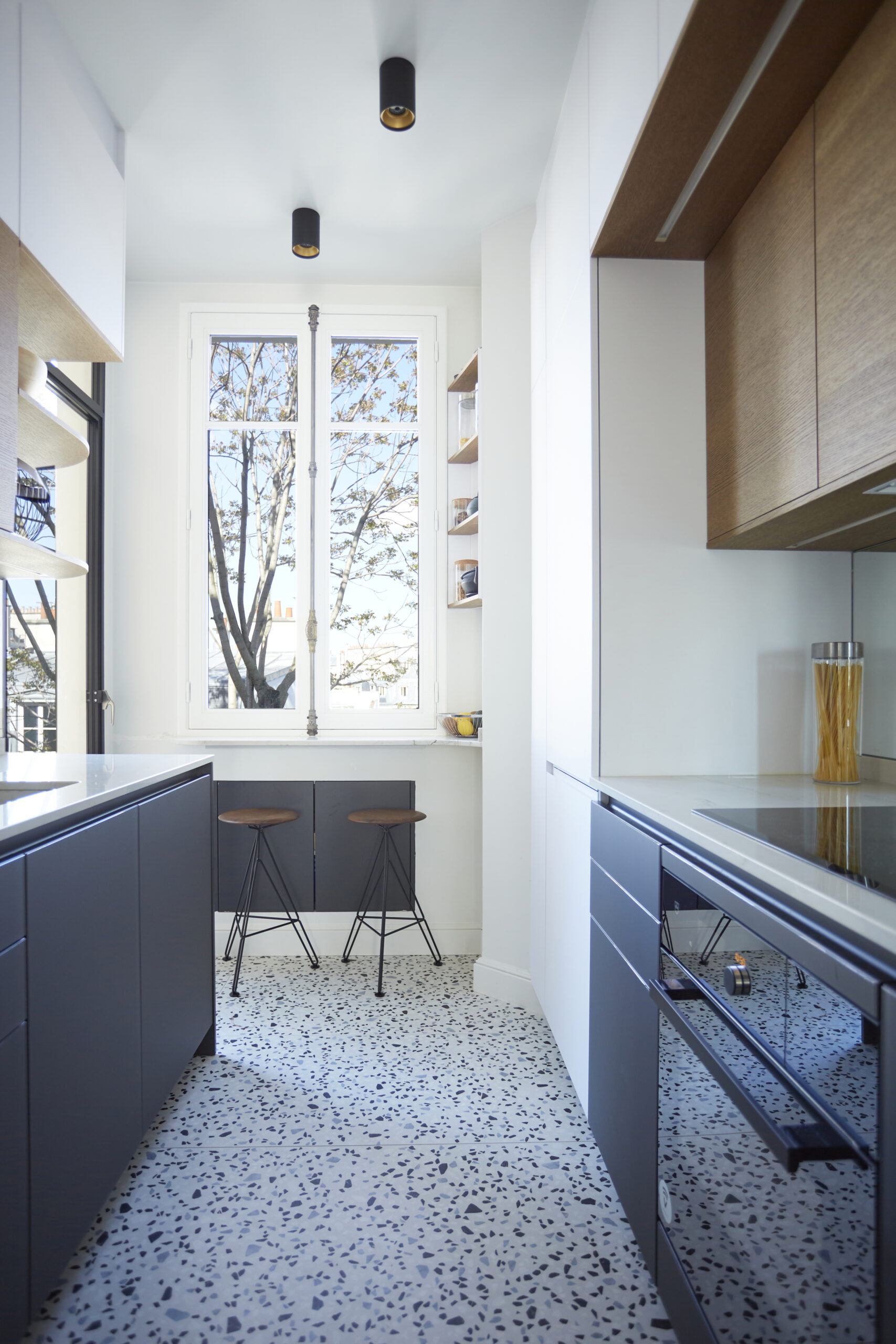 Fabriquée par nos soins sur mesure, une porte verrière permet d’accéder à la cuisine et de conserver la lumière et la vue en profondeur sans cloisonner les espaces. De cette cuisine on accède au balcon qui donne directement sur les arbres, un atout de plus pour cet appartement qui permet une évasion complète dans la verdure, véritable luxe.