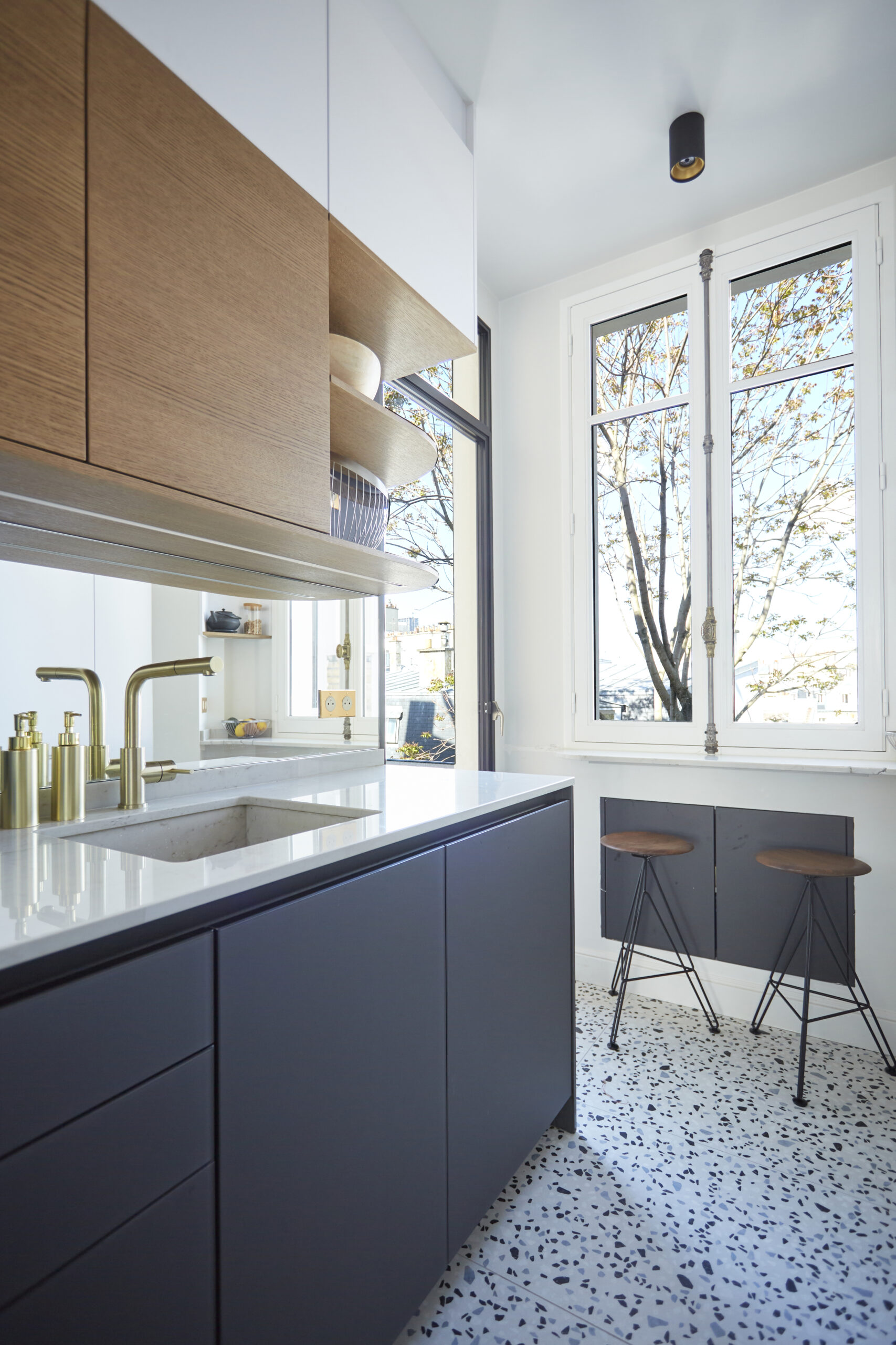 Tout le réseau de plomberie a été rénové, les alimentations et évacuations reconfigurées selon les nouveaux besoins des clients, et un magnifique carrelage en terrazo de chez Surface Carrelage Paris a été posé. Moucheté et clair à la fois, une tendance qui revient ces dernières années, le terrazo s’invente et se réinvente sur tout types de supports. Texturé, coloré, il habille les sols, les murs et même les plans de travail et plans vasques.
