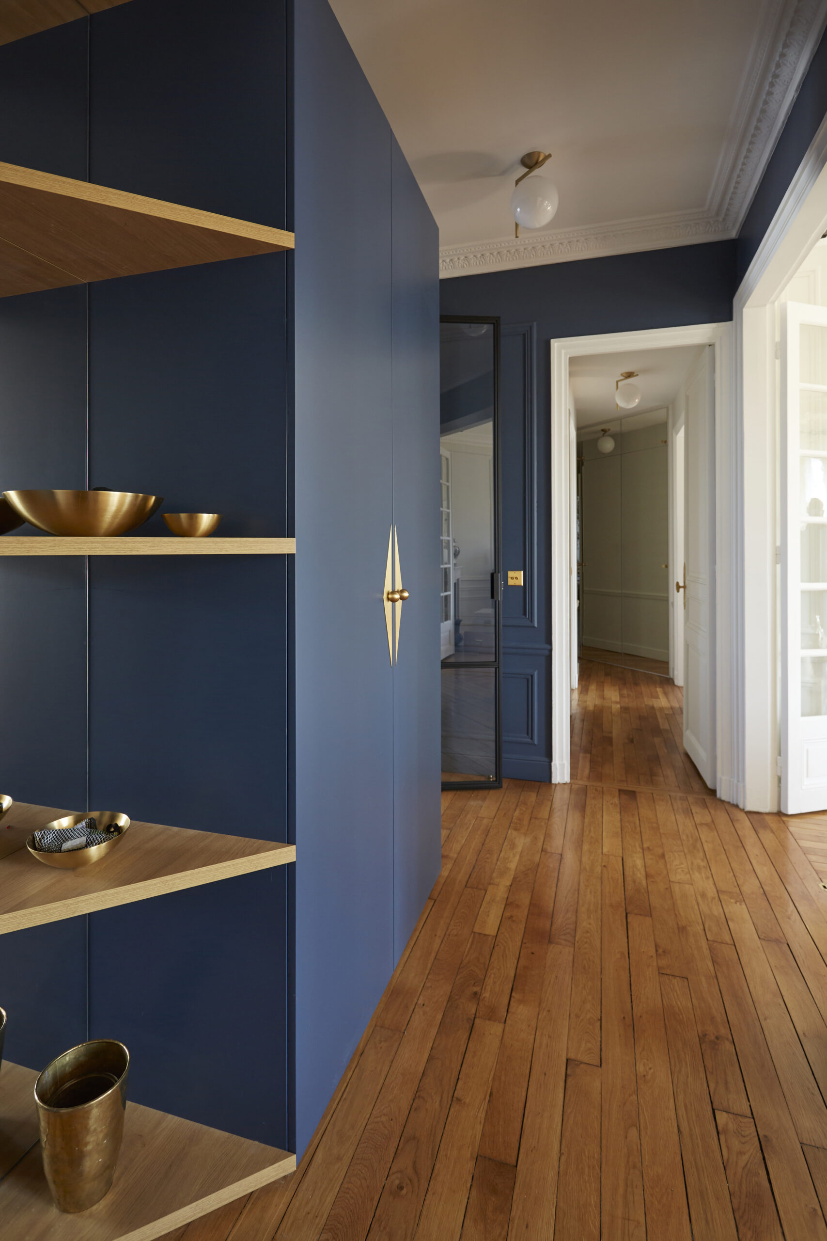 La finition laiton des poignées dorés Bonnemazou Cambus de chez la Quincaillerie Saint Germain sont comme une étoile dans la nuit qui crée dès l’entrée un jeu de lumière clair obscur. Les bibelots posés sur les étagères en finitions cuivre sont une introduction à la suite de l’appartement qui mélange bleu, blanc, bois, avec une touche de laiton.