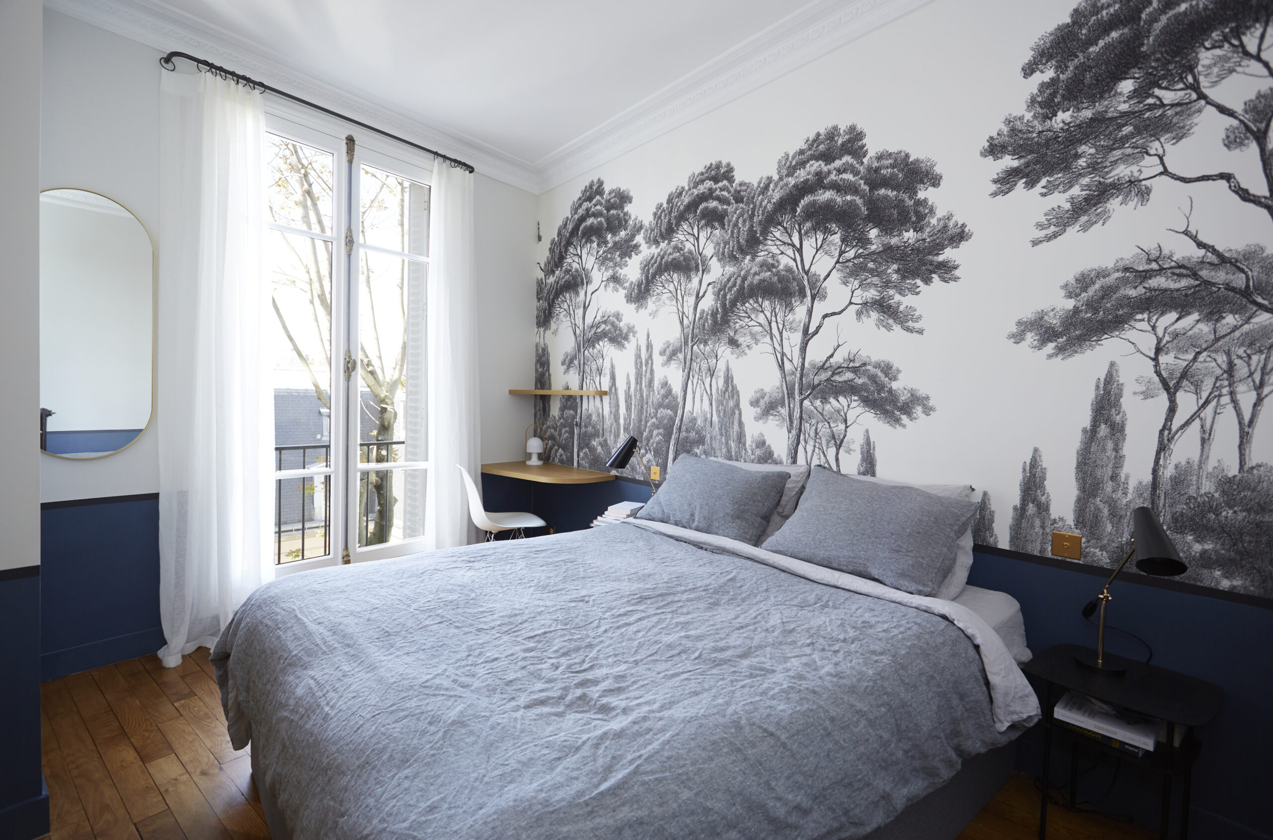 Au fond du couloir on accède à la chambre master avec sa salle de bain privative. Dans cet espace intime, un papier peint panoramique de chez Ananbo permet de se perdre au cœur des cyprès et des pins.