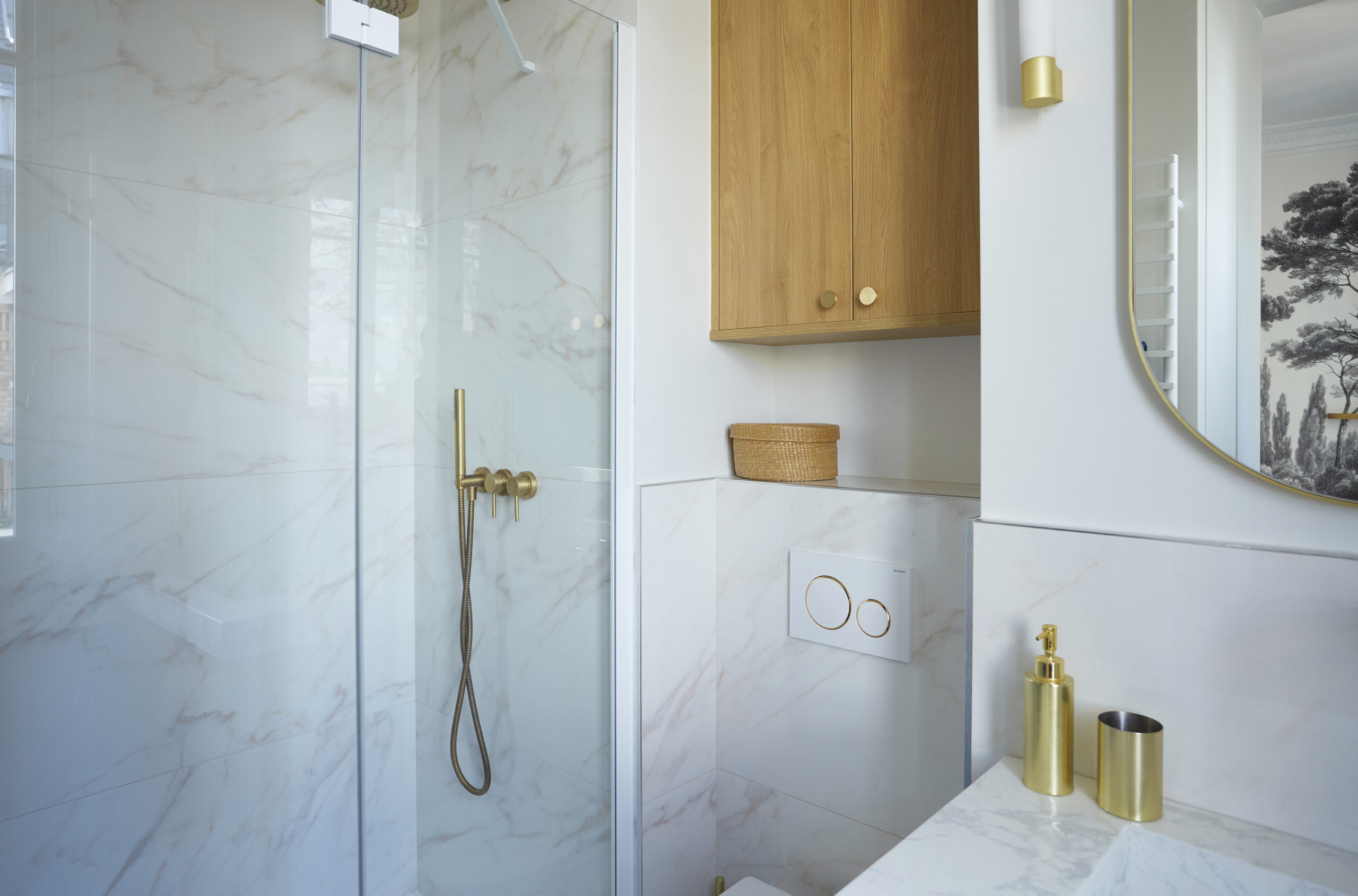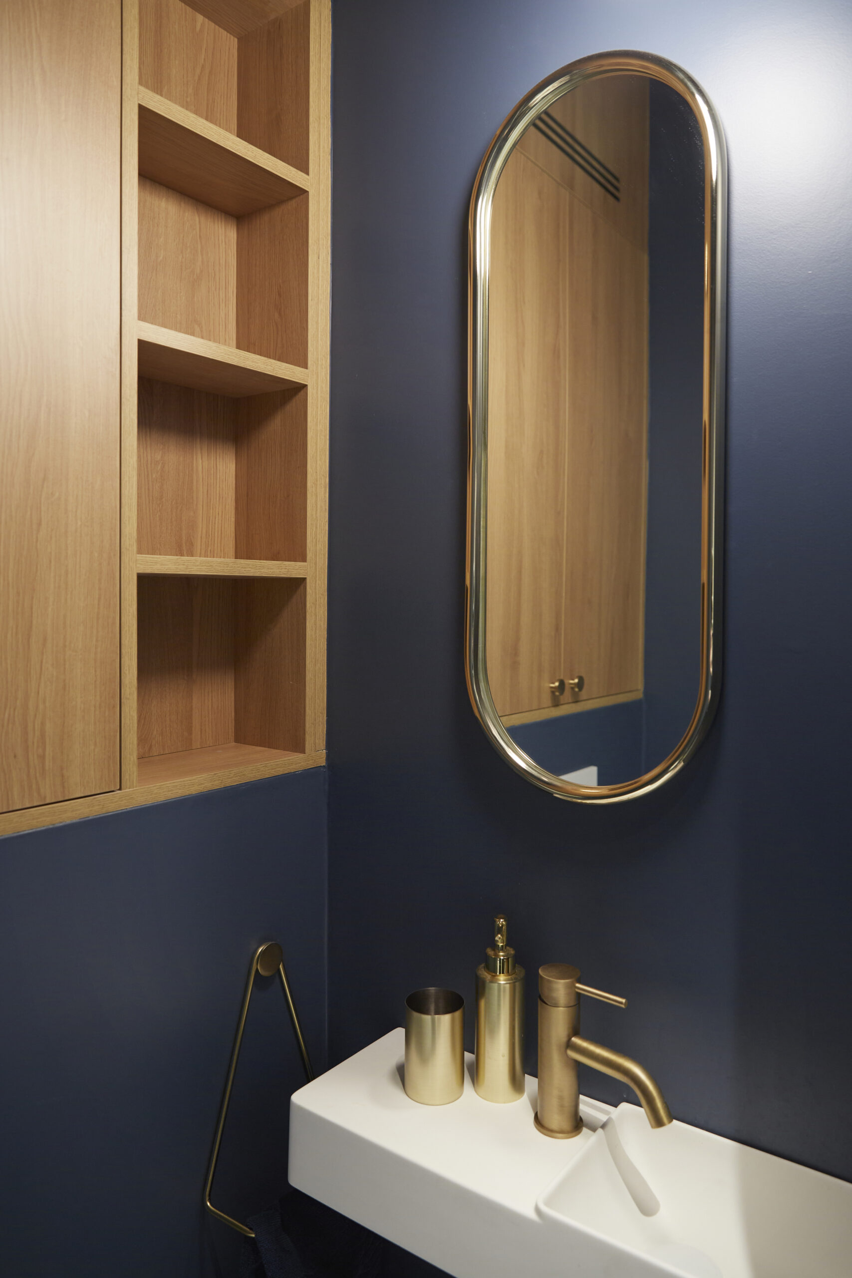 Dans les toilettes, on retrouve les mêmes couleurs de l’appartement et cette envie d’harmonie entre bleu, blanc, bois et laiton. Le petit meuble sur mesure épouse les murs et donne charme et douceur à cet espace intime. Les détails dorés que l’on retrouve en petites touches plus ou moins discrètes au fil de l’appartement, comme la plaque de déclenchement accordée à la robinetterie et au miroir, témoignent du goût des clients et leur sens de l’harmonie.