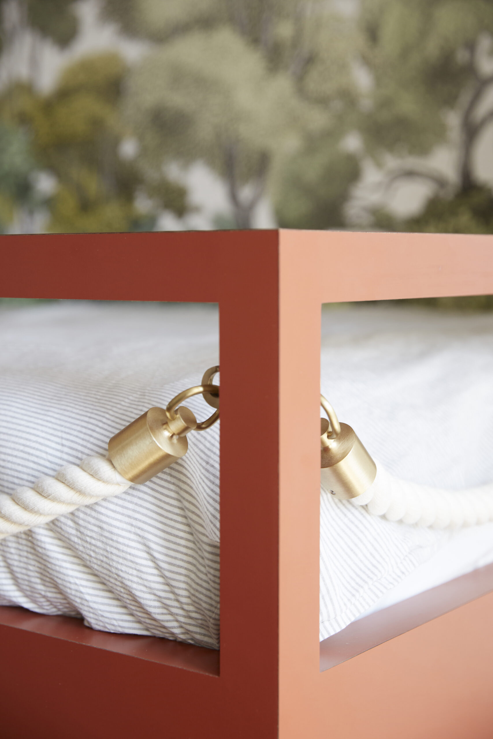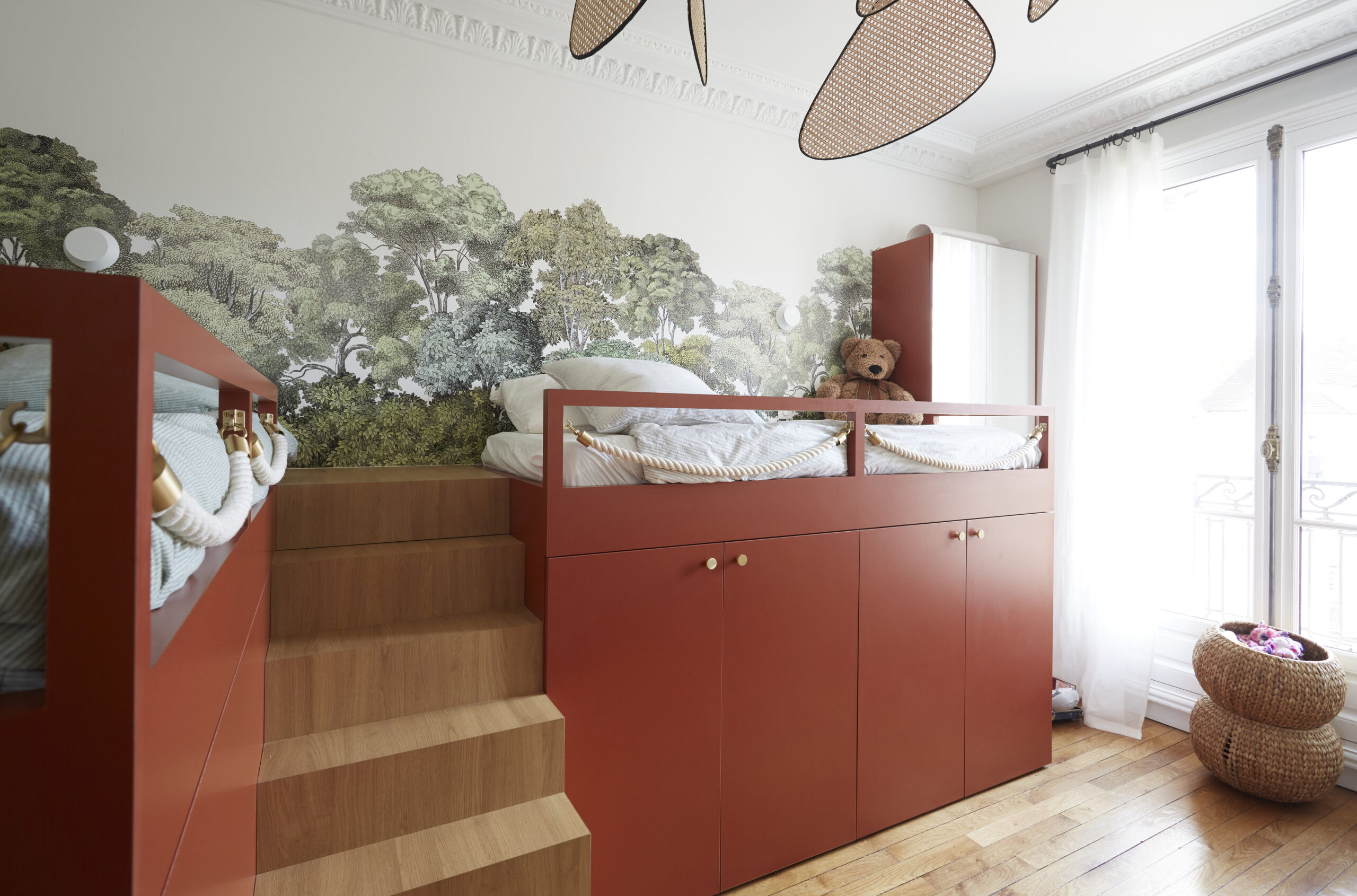 L’escalier en bois associé au papier peint panoramique de chez Rebels Walls, donne à ces deux lits sur mesure de faux airs de cabane dans les arbres, et fait de cette chambre un équilibre parfait entre calme, rêverie et évasion.