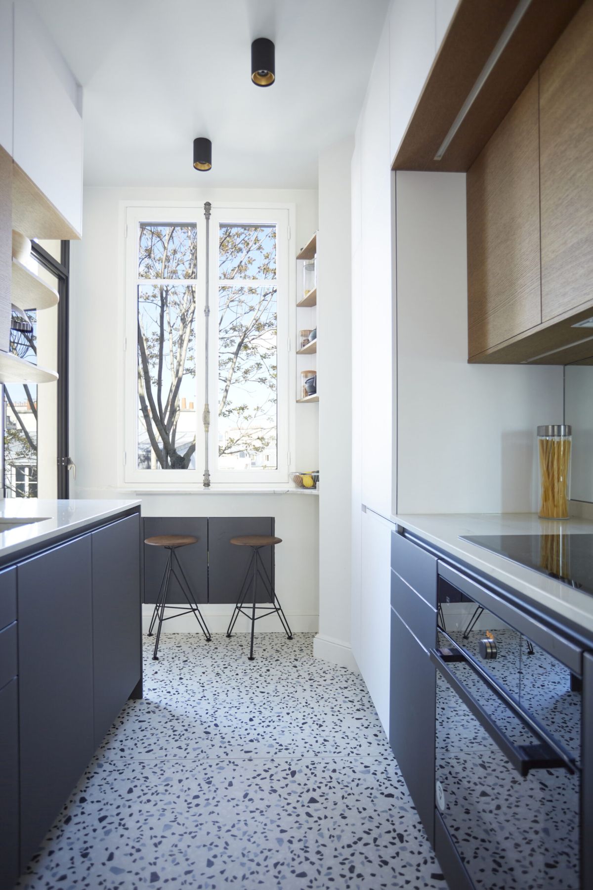 Lumineux, cet appartement familial de 105m2 a été entièrement rénové par nos équipes en partenariat avec les agences La Petite Etoile, Axiome Interior Design & Maison Sama. En plus de la rénovation complète du bien nous avons également fabriqué et posé l’ensemble des menuiseries sur mesure, mélangeant laque, bois de placage et stratifié. En résulte un appartement qui conserve sa lumière naturelle, optimise les espaces, et dégage une atmosphère reposante et élégante à la fois. Cerise sur le gâteau, sa vue sur le Panthéon d’un côté et les arbres de l’autre offre un spectacle magique et majestueux au quotidien.
