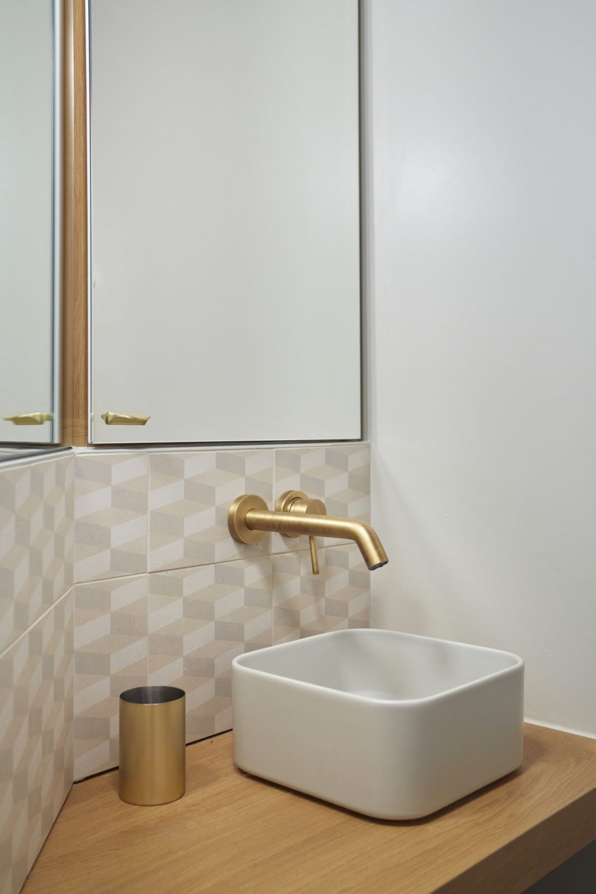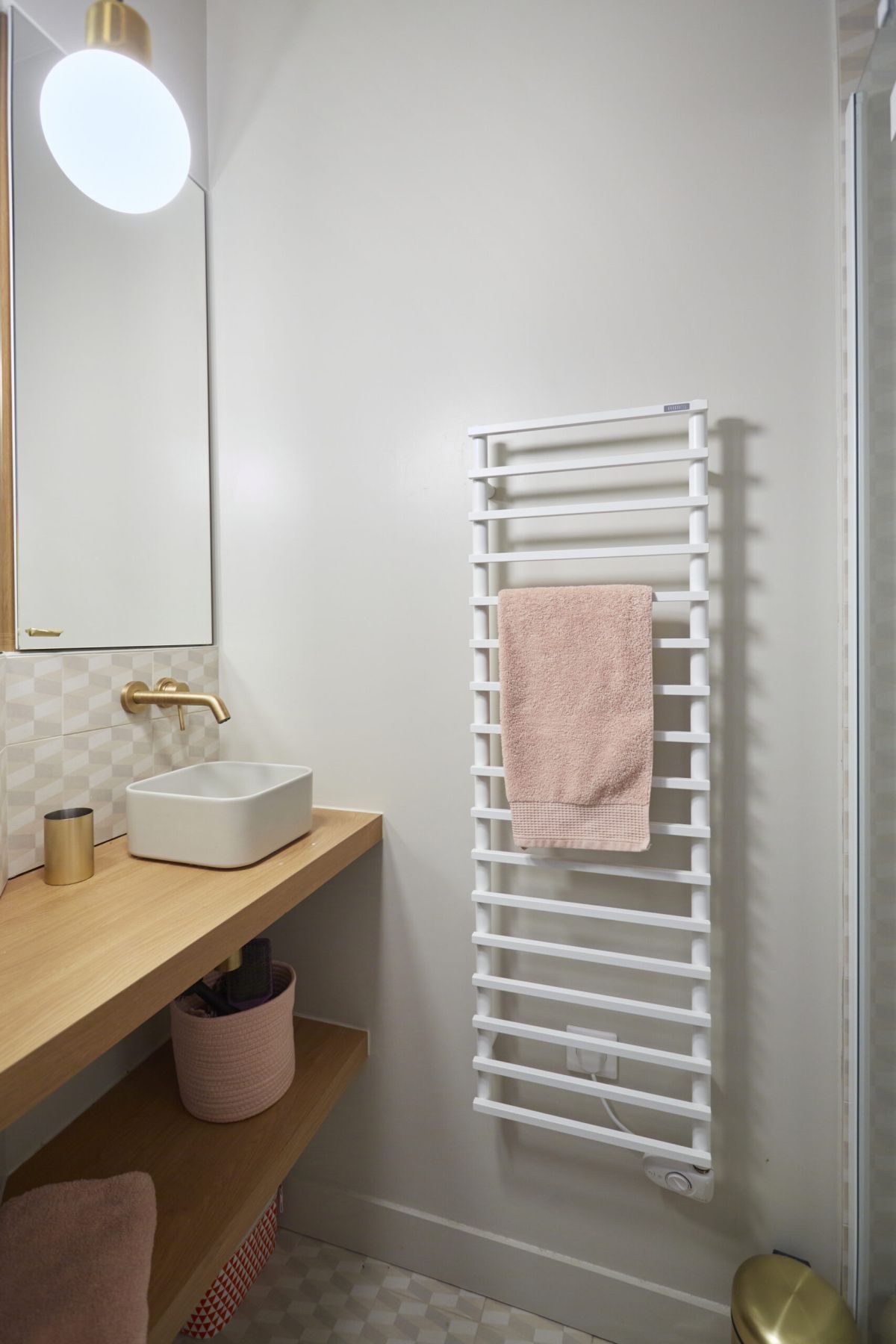 Une petite salle de bain pour les enfants a été créée malgré le peu d’espace dont nous disposions. Comportant une vasque carrée en céramique posée sur un plan en stratifié chêne sur mesure, ainsi qu’une robinetterie encastrée en finition laiton – une autre touche qui rappelle le reste de l’appartement – la salle de bain mélange esthétique et praticité.