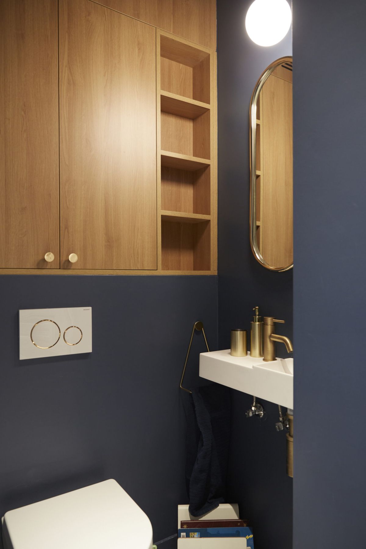 Dans les toilettes, on retrouve les mêmes couleurs de l’appartement et cette envie d’harmonie entre bleu, blanc, bois et laiton. Le petit meuble sur mesure épouse les murs et donne charme et douceur à cet espace intime. Les détails dorés que l’on retrouve en petites touches plus ou moins discrètes au fil de l’appartement, comme la plaque de déclenchement accordée à la robinetterie et au miroir, témoignent du goût des clients et leur sens de l’harmonie.
