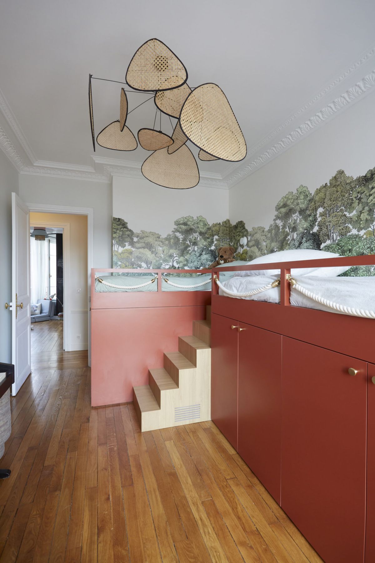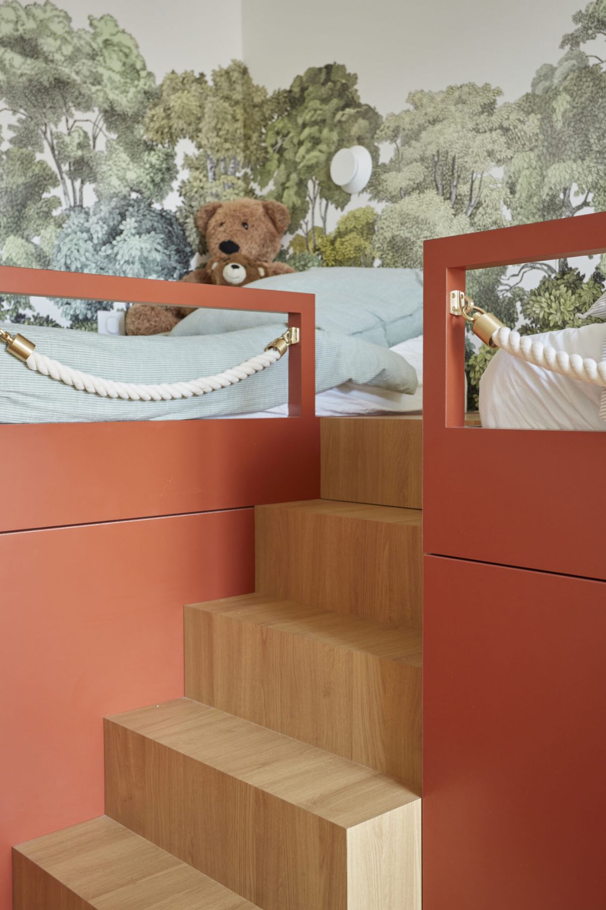 L’escalier en bois associé au papier peint panoramique de chez Rebels Walls, donne à ces deux lits sur mesure de faux airs de cabane dans les arbres, et fait de cette chambre un équilibre parfait entre calme, rêverie et évasion.