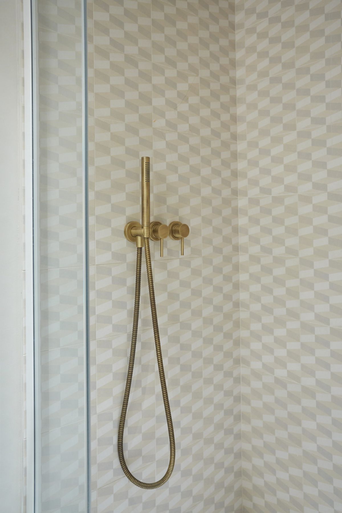 Avec son carrelage cubique et ses effets de reliefs qui créent une illusion d’optique, cette salle d’eau fait de sa petite taille une force et joue avec les perspectives.