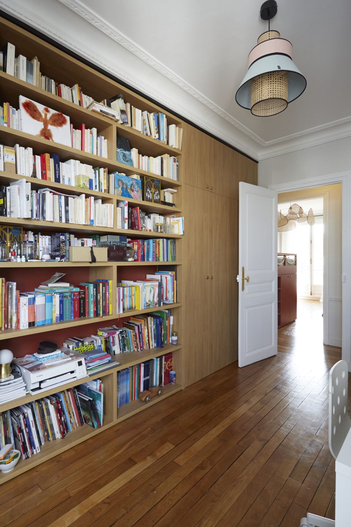 La menuiserie sur mesure qui l’habille de l’entrée aux chambres et aux salles de bains, renforce le caractère et l’identité affirmée de cet appartement familial aussi lumineux et élégant que bien situé.