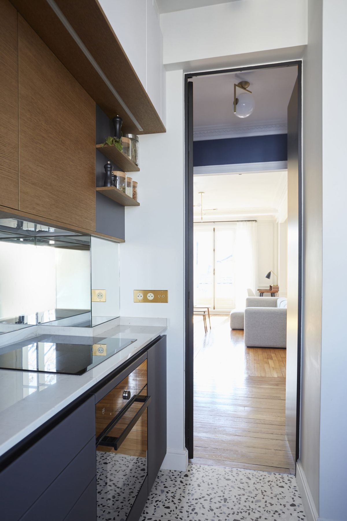 La finition laiton des poignées dorés Bonnemazou Cambus de chez la Quincaillerie Saint Germain sont comme une étoile dans la nuit qui crée dès l’entrée un jeu de lumière clair obscur. Les bibelots posés sur les étagères en finitions cuivre sont une introduction à la suite de l’appartement qui mélange bleu, blanc, bois, avec une touche de laiton.