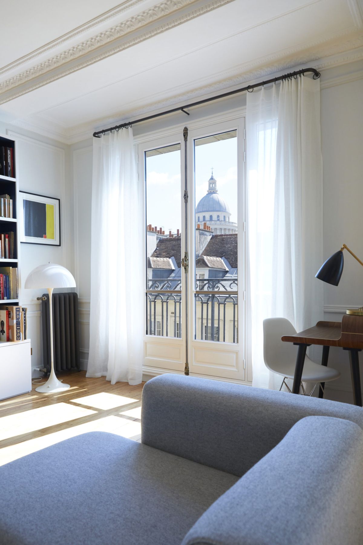 Depuis le canapé du salon, on aperçoit le dôme du Panthéon qui domine le quartier latin. La grande bibliothèque sur mesure en laque mélange du blanc et le même bleu que dans l’entrée.