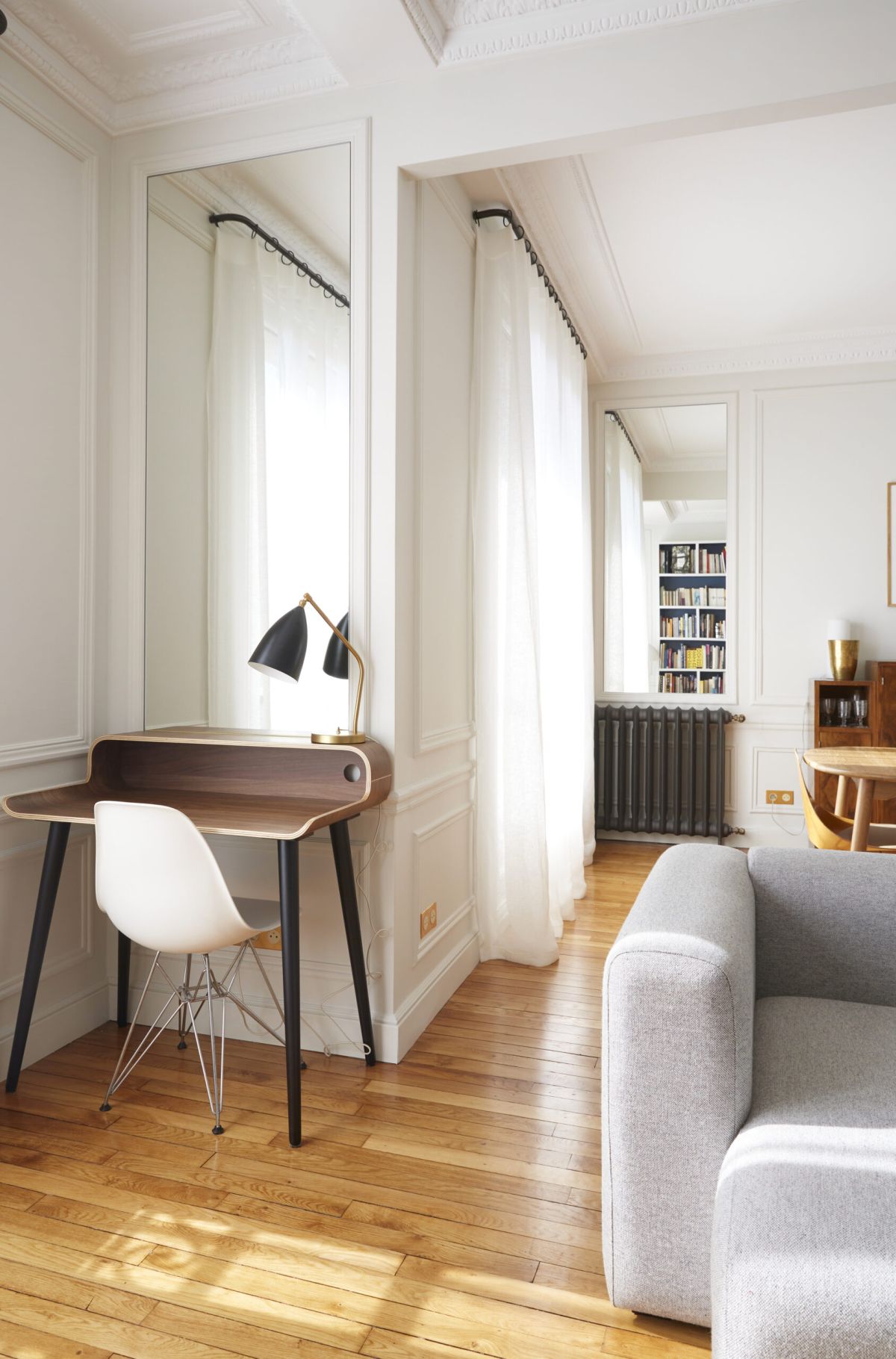 Trois tables gigognes ont été intégrées à l’espace afin de ne pas prendre trop de place face à cette grande bibliothèque, elles font un rappel à la couleur du parquet et du fond de la bibliothèque ainsi qu’aux voilages des fenêtres. Les miroirs ajoutés aux différents coins de la pièce permettent un agrandissement et une illumination de la pièce.