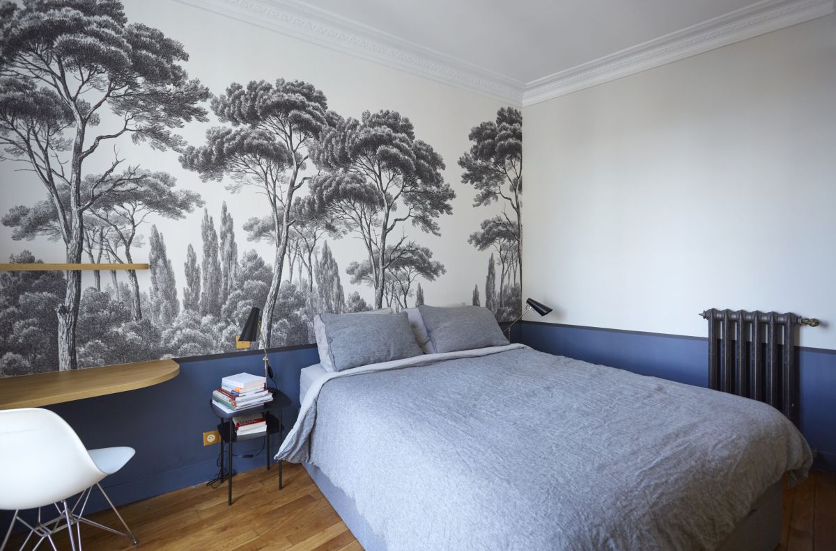 Au fond du couloir on accède à la chambre master avec sa salle de bain privative. Dans cet espace intime, un papier peint panoramique de chez Ananbo permet de se perdre au cœur des cyprès et des pins.
