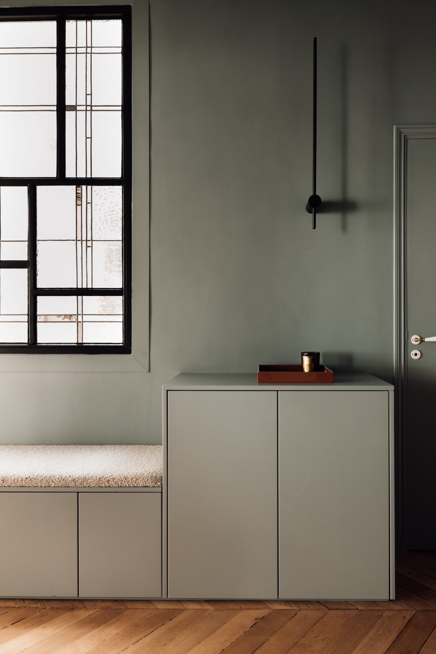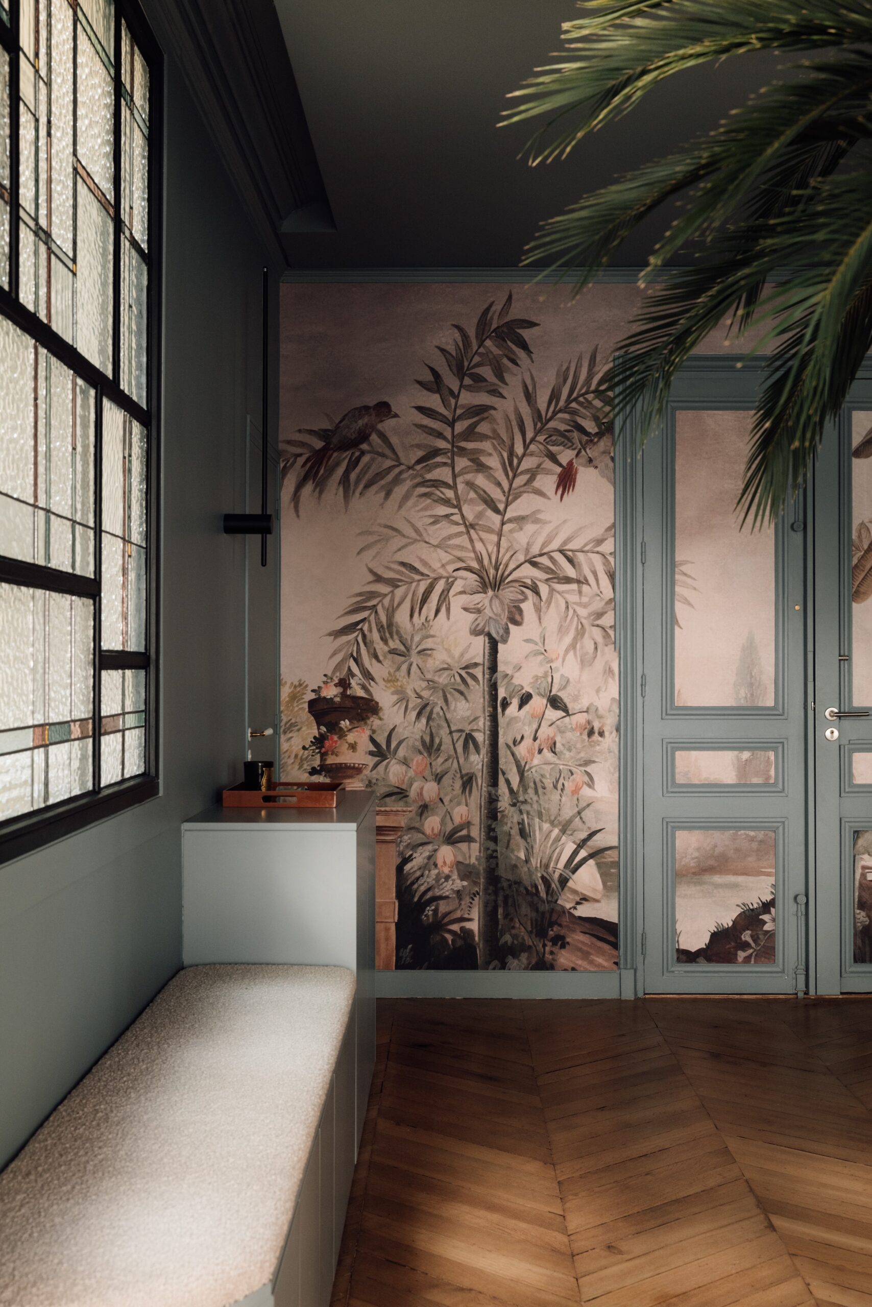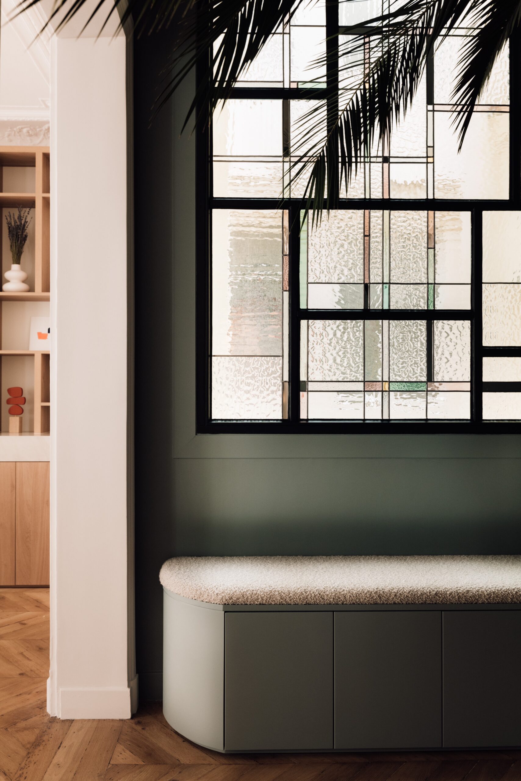 Un sentiment d’atypique dès le pas de la porte avec ce magnifique papier peint tropical de chez Ananbo. Avec ses motifs enchanteurs et oniriques il s’associe à un vitrail inspiré des œuvres de l’artiste Piet Mondrian. Conçu par l’Âme du Vitrail, il magnifie une banquette laquée sur mesure dont la couleur fait écho au papier peint. Son angle cintré donne le ton d’un appartement marqué par les rondeurs. Le parquet existant poncé et vitrifié, retrouve quant à lui sa splendeur originelle et apporte une touche d’élégance et de modernité.