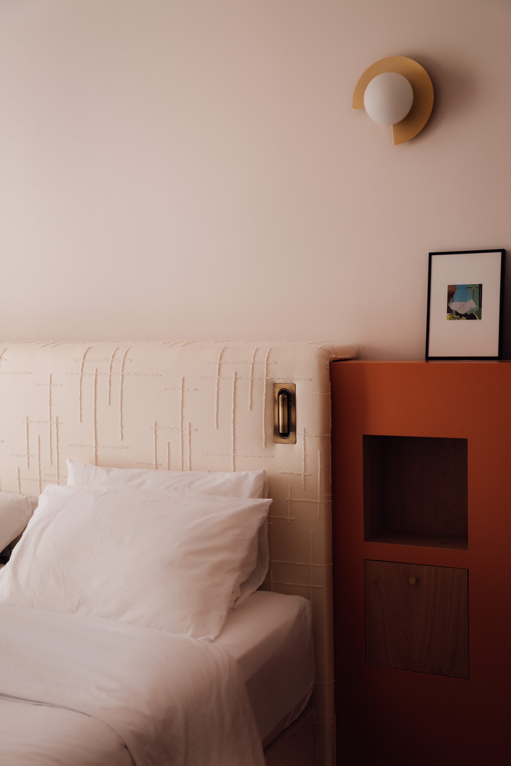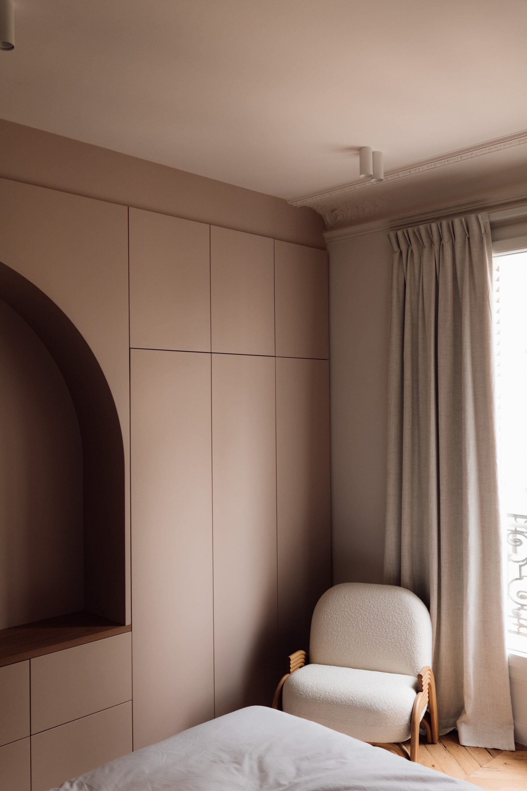 Dans la chambre principale, l’esthétique géométrique se poursuit. Le dressing sur mesure, conçu et laqué dans notre atelier de Porto, s’intègre harmonieusement à l’ensemble. On retrouve ces détails linéaires sur la tête de lit avec les petites niches carrées de chaque côté. Laque et cuir se mélangent pour former un meuble original qui s’accorde à merveille avec la belle arche cintrée du dressing.