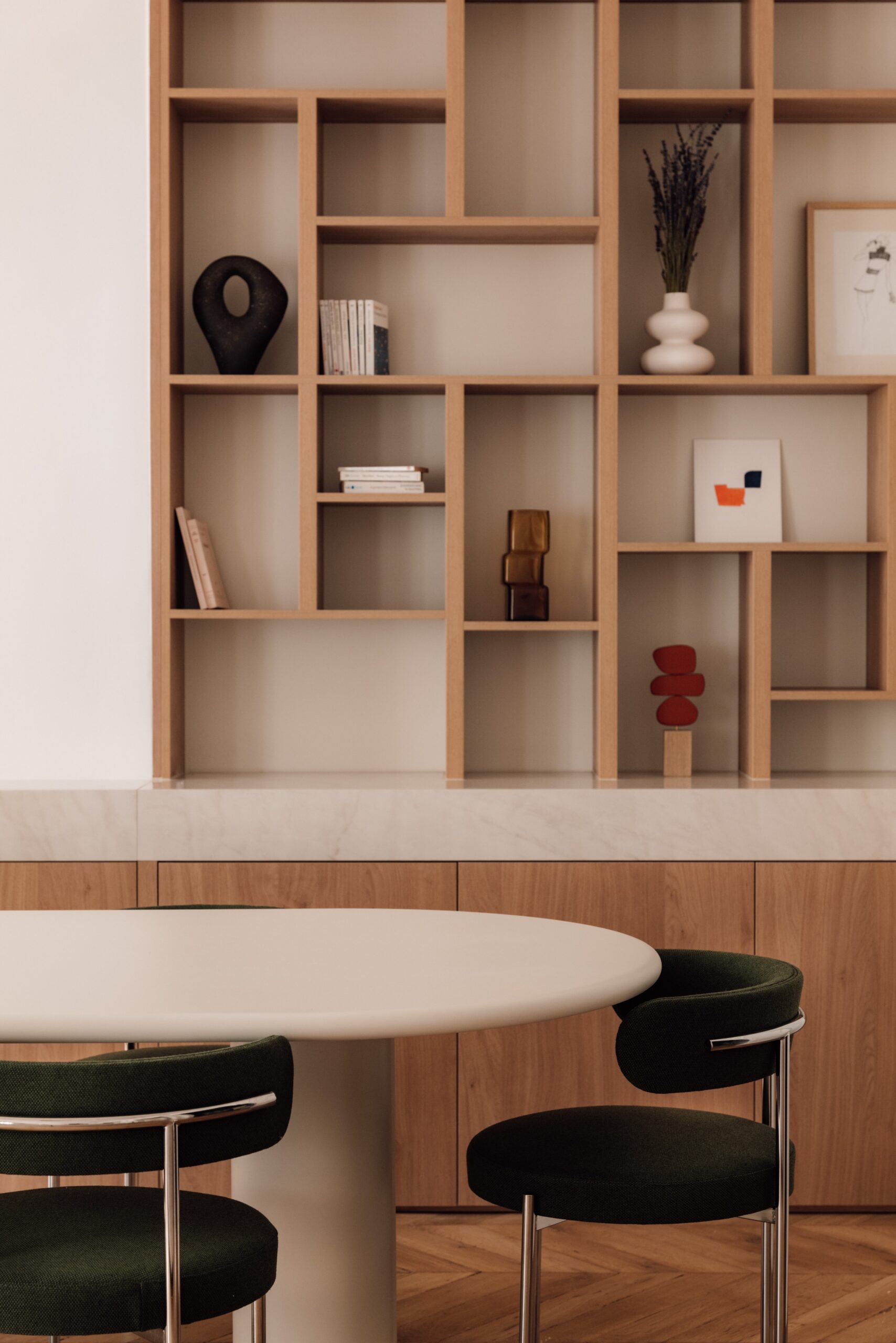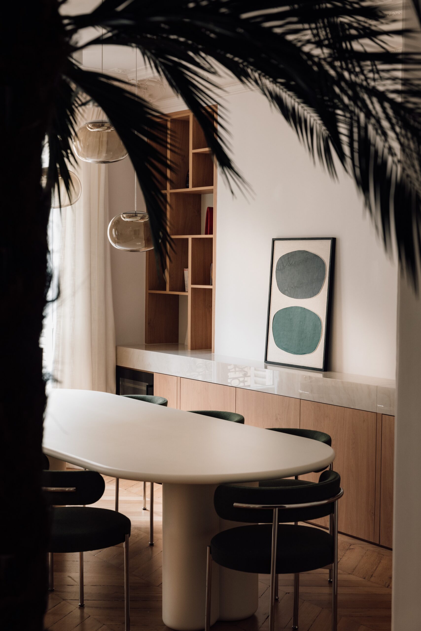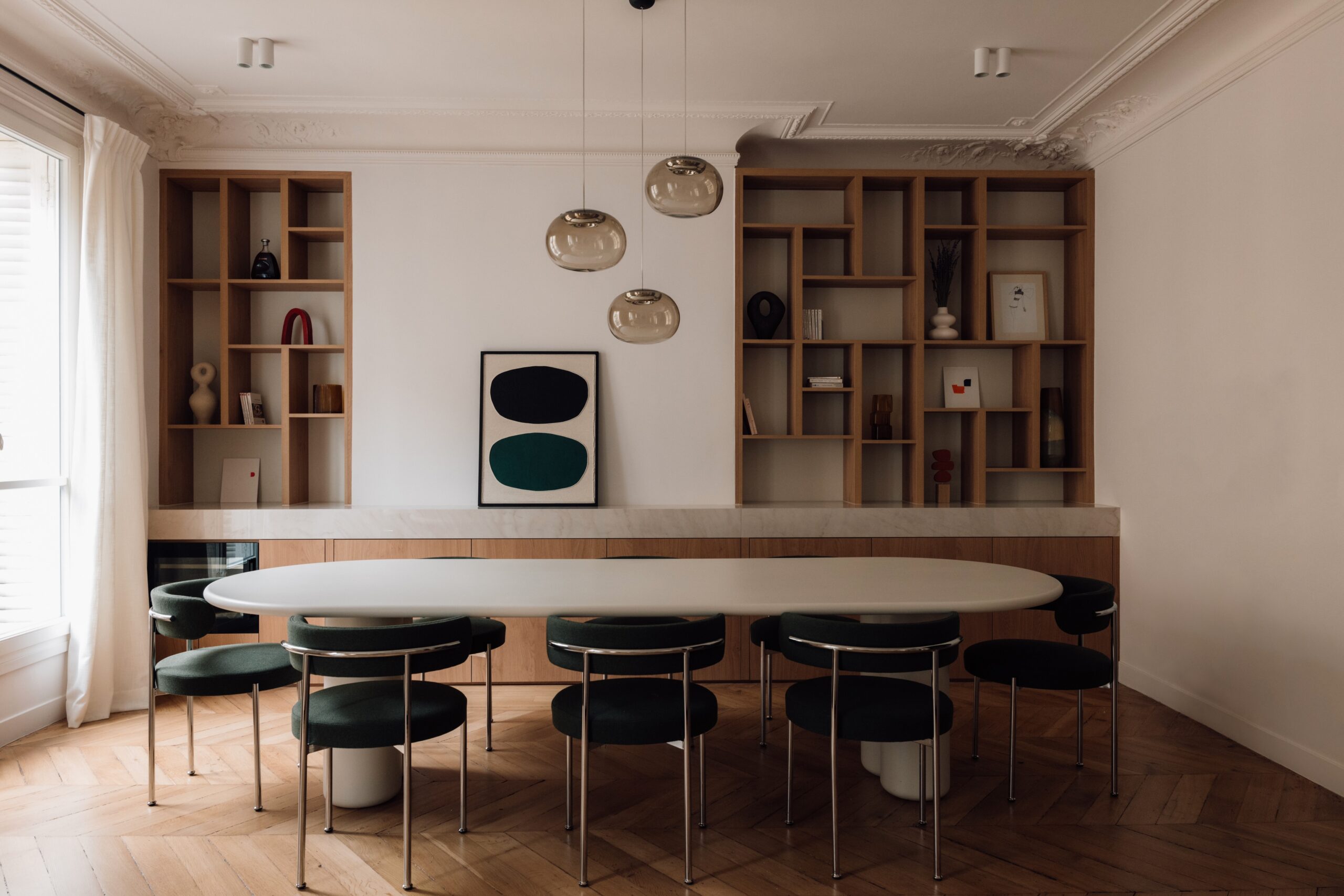 La salle à manger un jeu de formes et de perspectives prend vie avec une bibliothèque combinant placage chêne et pierre. Les niches carrées contrastent avec les courbes des chaises, des luminaires, de la table et du magnifique parquet en point de Hongrie restauré, créant ainsi un ensemble harmonieux et parfaitement équilibré.