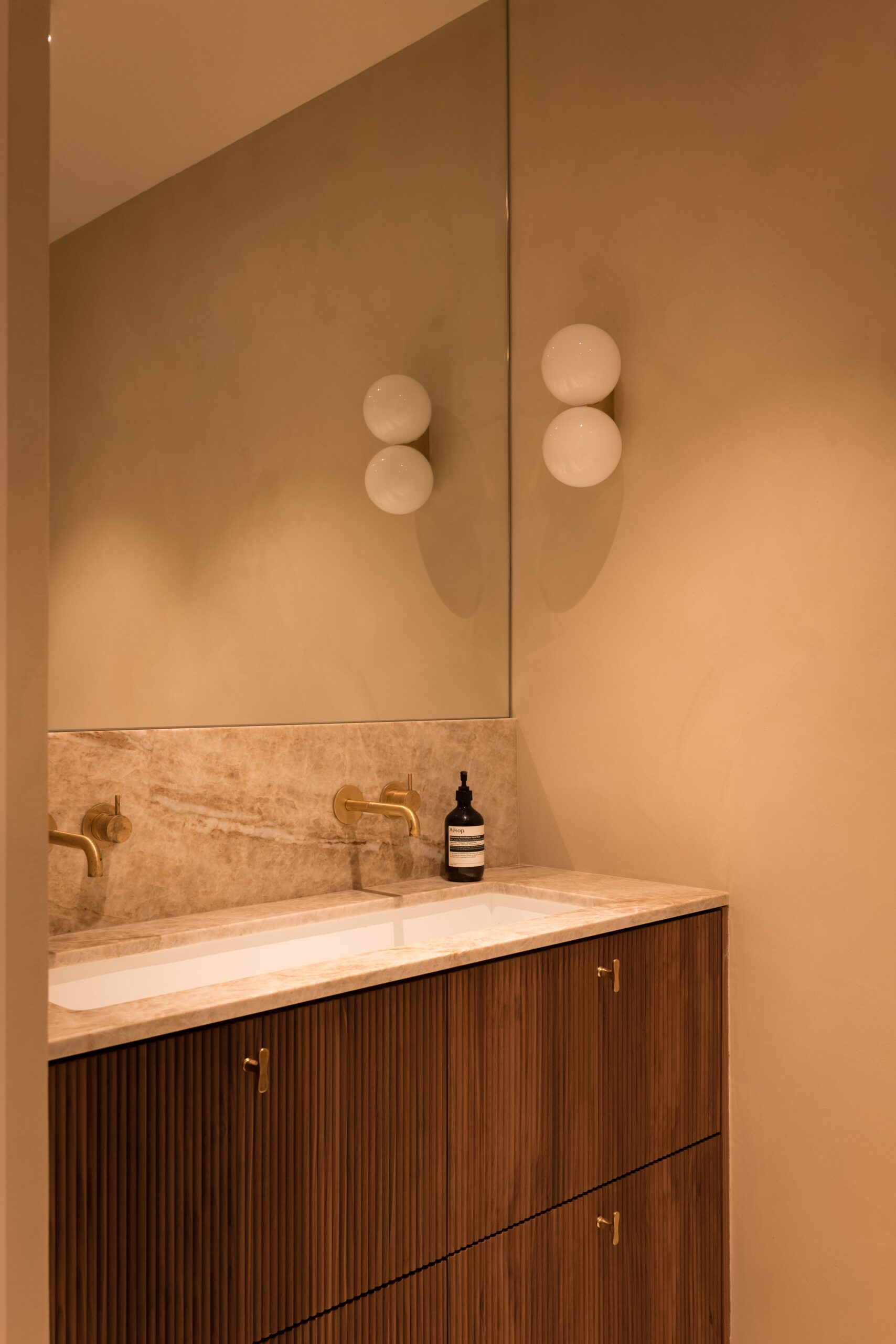 La salle de bain principale, teintée de nuances apaisantes de beige, intègre une douche et des niches en béton ciré, ainsi qu’une élégante baignoire îlot. La robinetterie encastrée en laiton ajoute une touche de raffinement à l’ensemble. Des spots au plafond mettent en valeur la double vasque en granite Taj Mahal et les façades rainurées du meuble vasque.