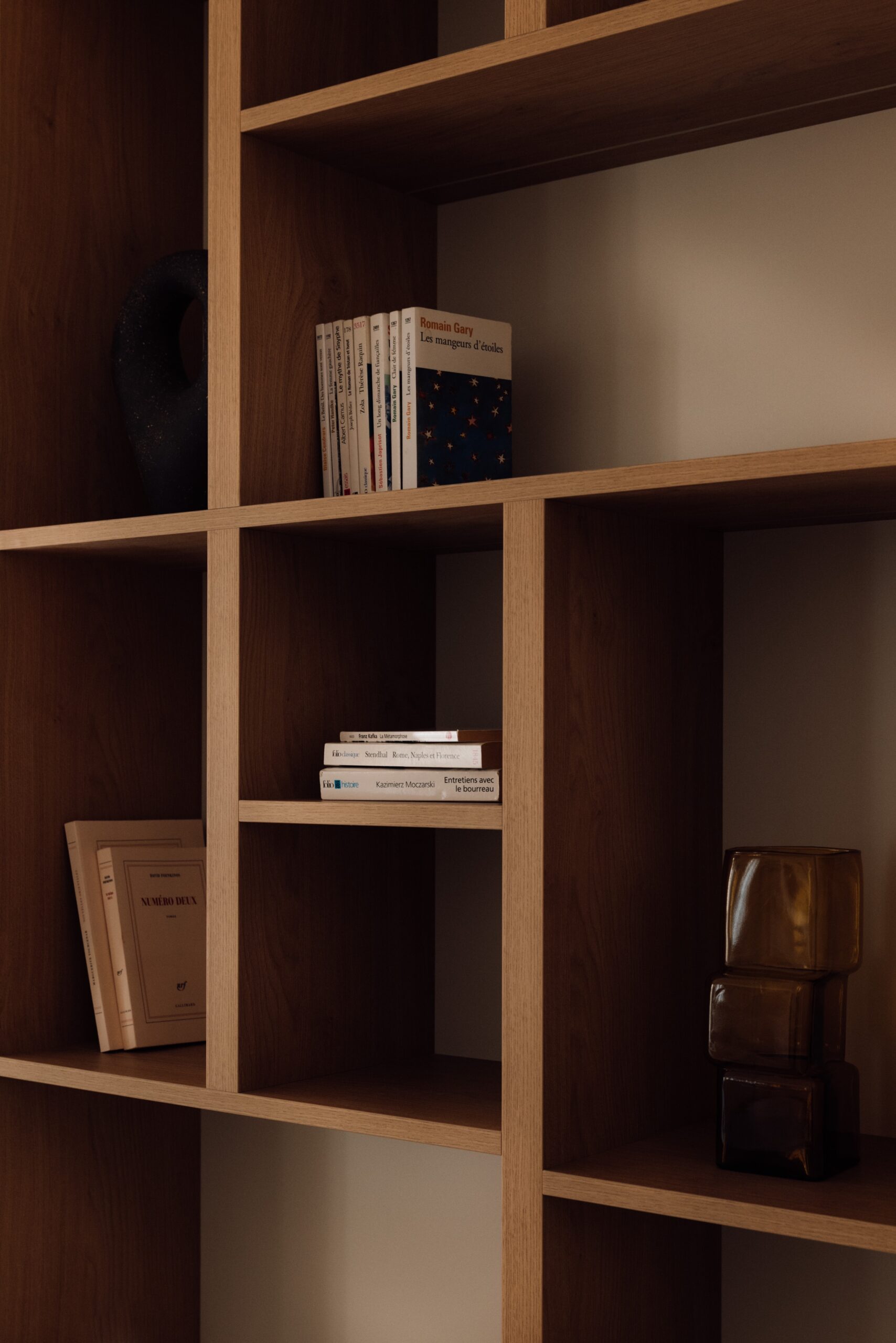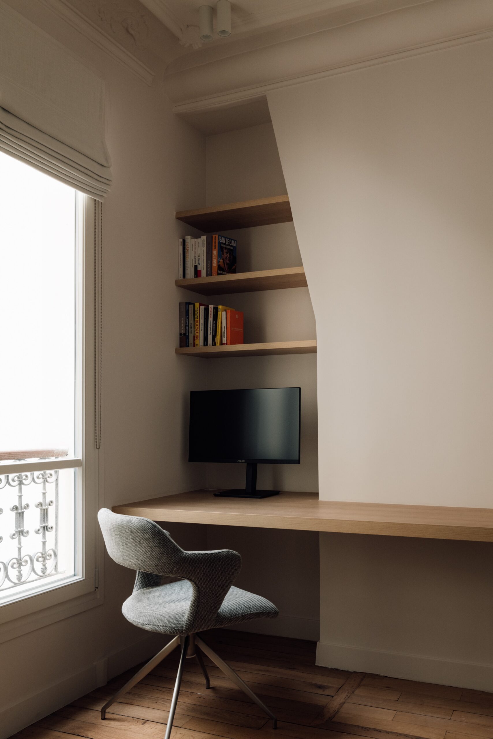 Pour s’adapter au mieux à l’espace, des étagères ont été minutieusement agencées dans une niche existante. Le bureau sur mesure en chêne naturel fixé sur tasseaux prisonnier s’intègre parfaitement le long du mur, et offre un résultat minimaliste d’une élégance millimétrée.