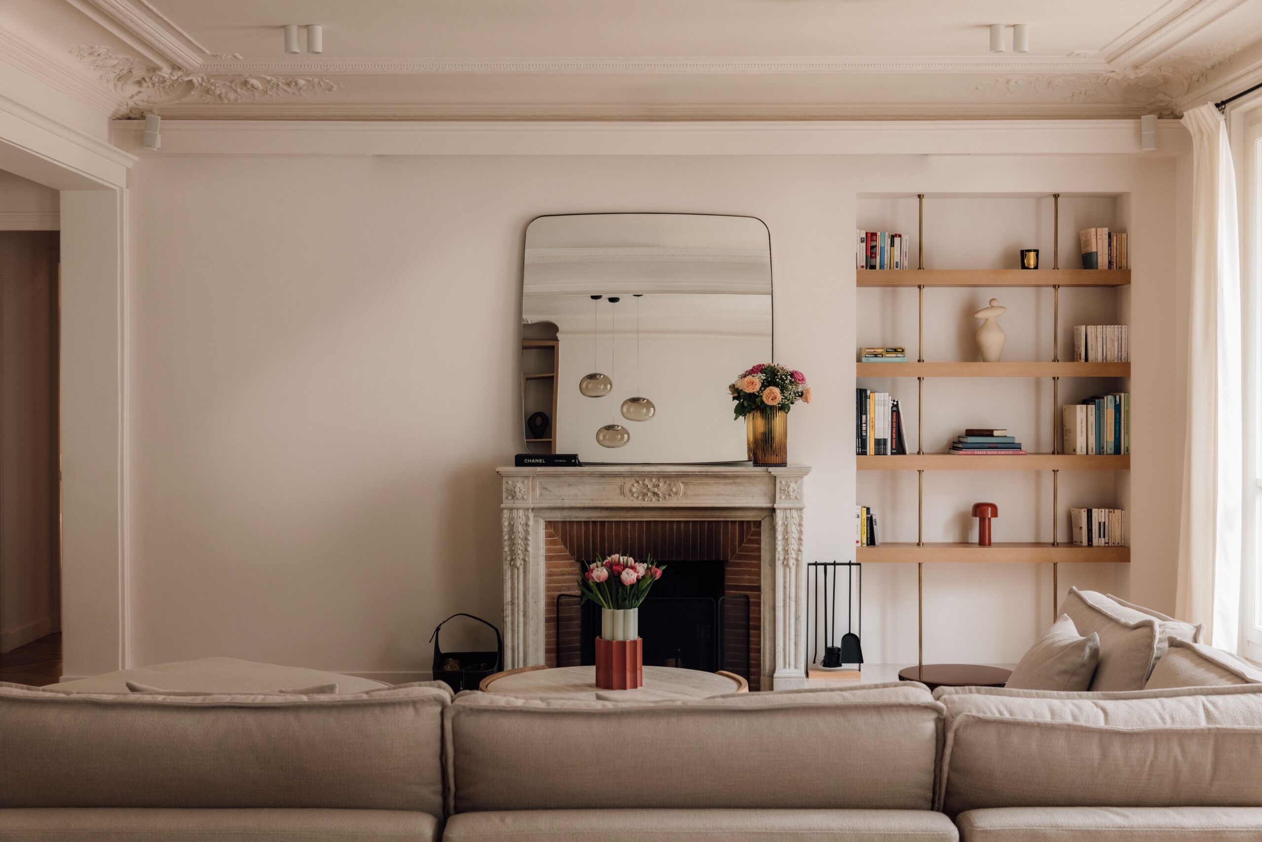 Le salon, organisé autour de la cheminée minutieusement préservée et restaurée pendant les travaux, donne une sensation d’intimité et de charme à la fois. Les étagères sur mesure en chêne, habillement insérées dans une niche existante, marquent une esthétique épurée. Les tiges en laiton qui les relient soulignent le caractère linéaire de l’appartement, accentué par les belles moulures au plafond. Restaurées et repeintes, elles retrouvent leur éclat et font toute l’élégance de cette pièce de vie.