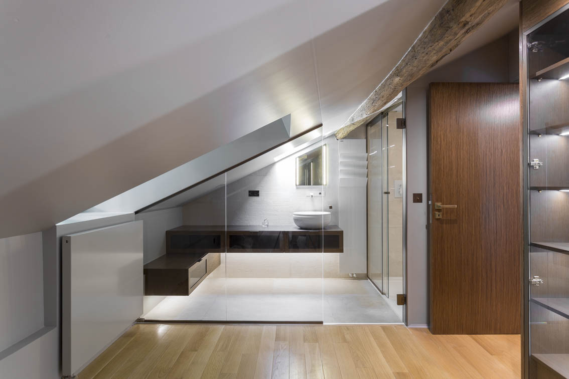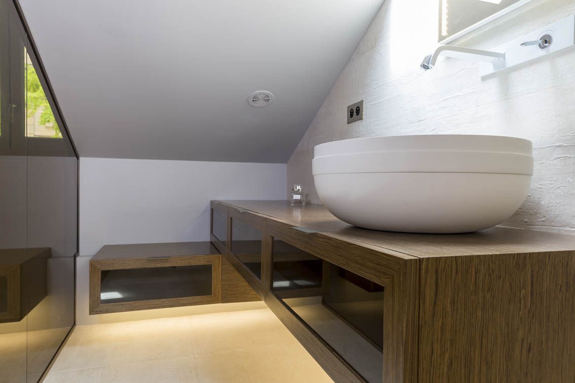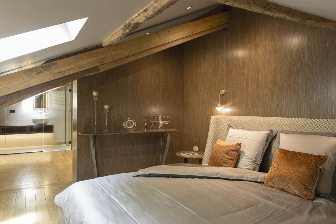 L’agence De Montaigne a imaginé cette superbe master suite de 90 m2. Kermarec y a réalisé la rénovation complète ainsi que toute la menuiserie sur mesure en placage chêne, le tout en sous pente. Cela nous a valu une publication dans le magazine Art & Décoration.